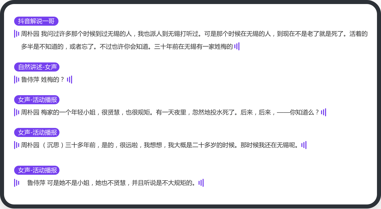 我是一名老師,為了讓同學(xué)們更好的理解知識(shí)點(diǎn),會(huì)做一些視頻課件,牛片的多人配音就很好,可以給角色配音,生成的配音可以像講故事一樣,我的學(xué)生都說(shuō)我做的視頻很有意思。